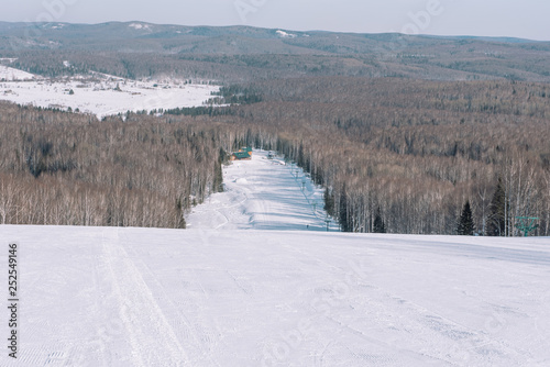 Winter mountain view from above. View down from the mountain in winter. Winter landscape. Winter in Siberia.