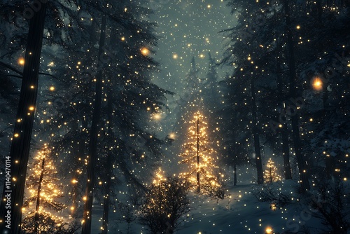 Winter Night with Snowflakes and Glowing Christmas Lights on Trees