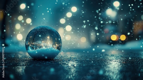 snow, globe, winter, night, city, light, bokeh, snowflake, cold, freezing, icy, dark, blue, teal, magic, enchantment, christmas, holiday, festive, season, sphere, glasses, crystal, urban, street, ground, blurred, sharpened, atmosphere, serene, calm, peaceful, dreamy, romantic, beautiful, artistic, photo, image, picture, photo