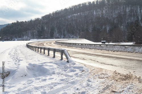 Winter road covered in snow horizontal copy space background image, winter travel theme, season weather advisory