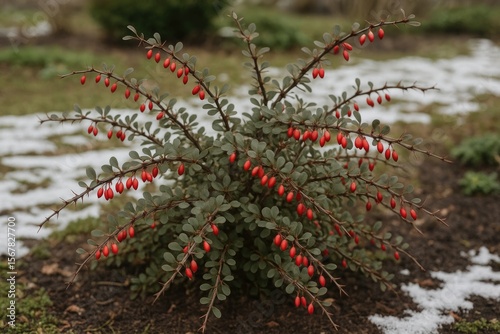 Winter scene featuring a thorny Berberis Thunbergii shrub with recent snowmelt warning