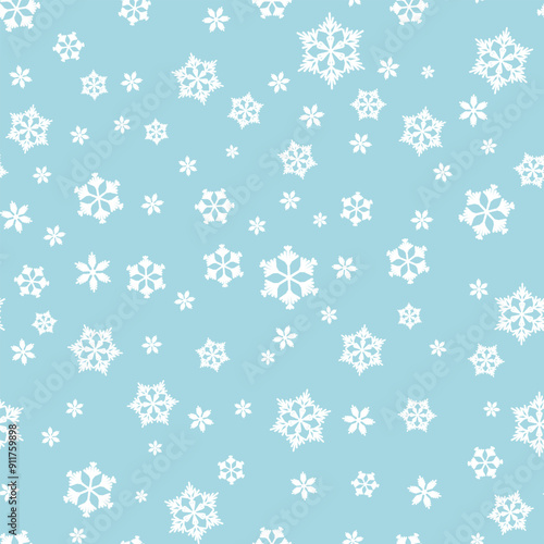 Winter seamless pattern with white snowflakes on blue background. Vector illustration for fabric, textile wallpaper, posters, gift wrapping paper. Christmas vector illustration. Falling snow