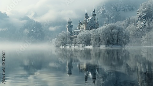 Winter season. Beautiful fantasy castle on a frozen lake, fantasy snow scenery