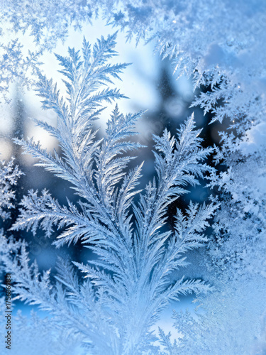 Winter snow background, frosty patterns on glass, cold blue tones