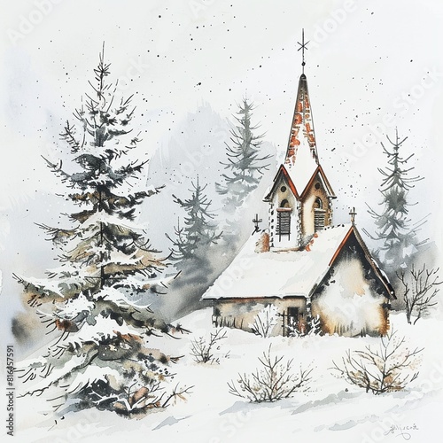 Winter snow scene with a small Christian chapel snow-covered trees in watercolor