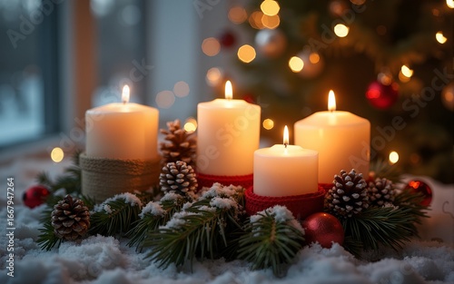 Winter solstice celebration with candles and evergreen branches, winter wonderland, snowflakes. High quality