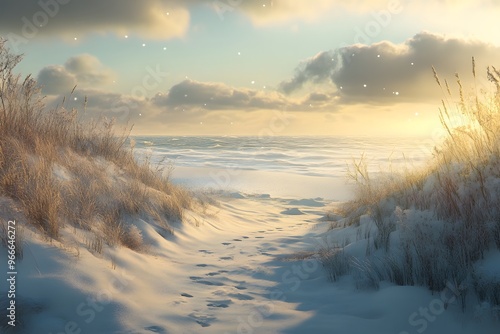 beach, snow, sunset, winter, sky, horizon, nature, coast, sand, ocean, sea, cloud, grass, glacé, icy, frost, landscape, path, footprint, gold, light, calm, serenity, peaceful, tranquil, white, blue, yellow, dawn, morning, cold, water, dune, natural, beautiful, scenery, photo, travel, sunshine, wave