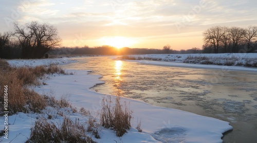 river, sunset, winter, snow, ice, water, sky, tree, sunrise, glacé, nature, landscape, gold, horizon, cold, calm, peaceful, serenity, sun, light, ray, frost, bank, field, grass, meadow, rural, outdoors, countryside, beautiful, natural, photo, photo, day, morning, early, dawn, colours, warm, orange, yellow, blue, white