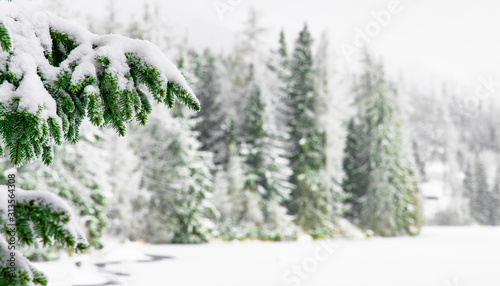 winter time forest unfocused landscape background with spruce needle branch under snow wallpaper pattern calm and peaceful scenic view empty copy space for your text here