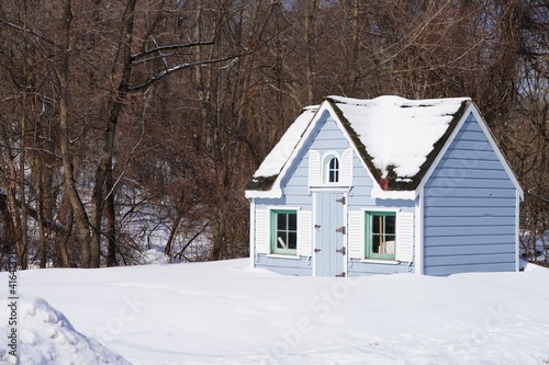 Winter view of a cute tiny house garden shed with white shutters after a snowfall