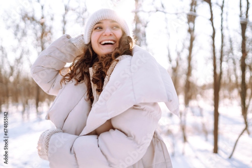 Winter walk. A smiling woman in winter clothes walks through a snowy forest on a sunny frosty day. Concept of walking, travel.