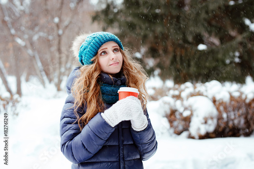 Winter walk in the park or the wood. The young beautiful girl the blonde with blue eyes in a warm cap and a down-padded coat.There is snowfall.