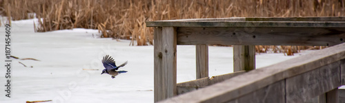 winter wetland scene featuring a wooden observation deck or bench and tall, dry grasses in the background
