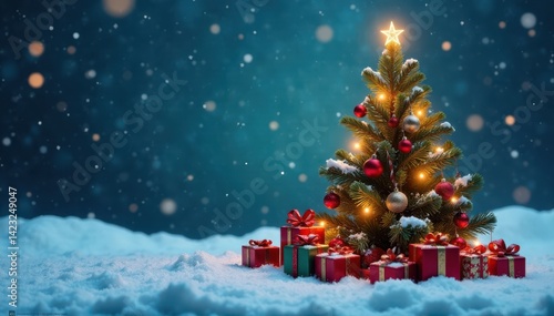 Winter wonderland Christmas tree surrounded by gifts, tree, winter
