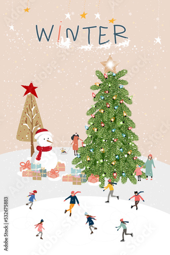 2023, background, banner, card, cartoon, celebration, christmas, cute, december, design, family, fun, gift, graphic, greeting, happiness, happy, holiday, iceskating, illustration, landscape, merry, nature, new, new year, park, people, playing, santa, season, sky, snow, snowflake, snowman, town, tree, vector, vertical, winter, winter landscape, christmas, year, christmas tree, art, fir, decoration, star