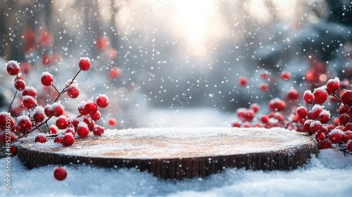 Winter Wonderland Scene Snow Covered Wooden Table with Red Berries