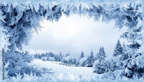 Winter wonderland scene with snow-covered trees and icy landscape in a serene outdoor setting