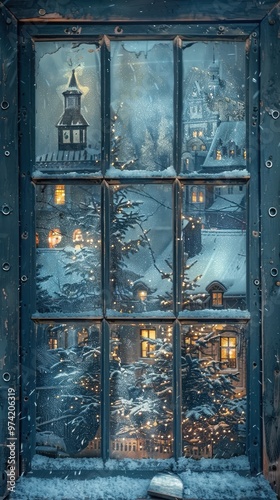 Winter Wonderland View: A quaint, cozy winter village scene glimpsed through a frosted window pane, with twinkling lights, snow-covered rooftops, and a church steeple in the distance