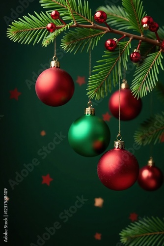 Winterberry branch with red and green ornaments hanging from a ceiling, Christmas balls, holiday decoration, green