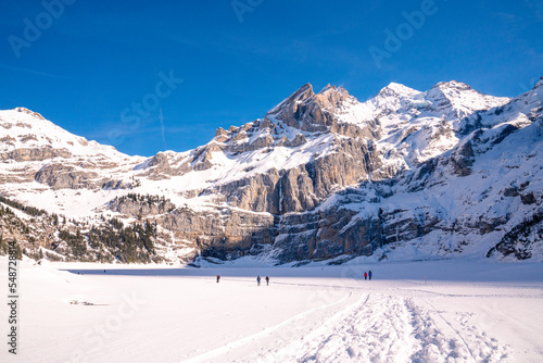 Wintersport in den Bergen in der Schweiz, Winterwanderung und Hiking im Schnee mitten in den Alpen