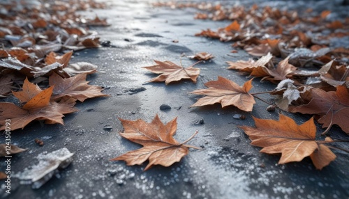 Wintry textured background with frost and fallen leaves, simple, barren, somber