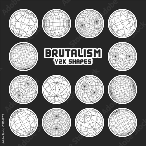 Wireframe shapes, lined sphere. Perspective mesh, 3d grid. Modern trendy low poly geometric elements. Retro futuristic design elements, y2k, vaporwave and synthwave style. Vector illustration