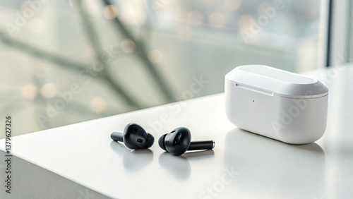 Wireless earbuds placed on clean white surface with minimalist design, modern technology and premium audio accessories for music lovers. Contemporary style and sleek product concept.