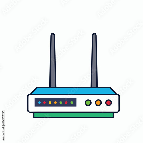“Wireless Router Vector Illustration – Stylized Device with Dual Antennas, Colored Indicator Lights, and Front Panel Details – Represents Internet Connectivity, Network Infrastructure, and Smart Home