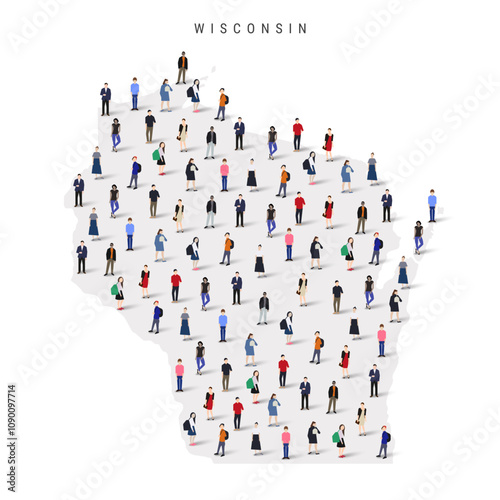 Wisconsin US state population map. Large group of realistic a diverse crowd of people figures. Flat vector illustration isolated on white.