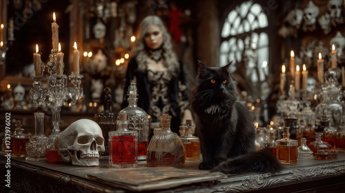 sorcerer, halloween, potion, shop, black, cat, candle, skull, bottle, magic, skittish, decoration, witchcraft, table, crystal, cauldron, eerie, atmosphere, night, black magic, lore, gothic, occult, herb, making, spell, book, mysterious, enchanting, spider's web, dark, secret, charme, folklore, hours, gathering, rustic, ambience, gloaming, celebration