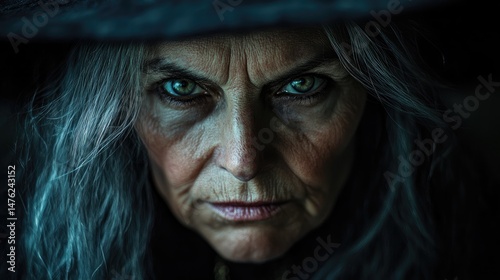 Witch'S Gaze: Intense Stare Of An Old Woman In A Dark Hat, Perfect For Halloween Or Fantasy Themes.