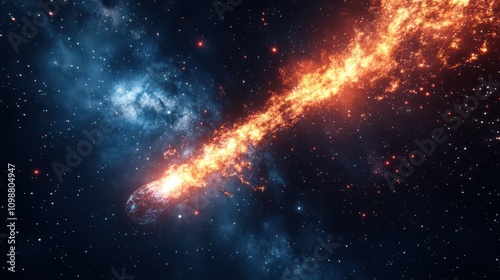With a glowing trail of flames, a fiery comet or meteor streaks through the stars