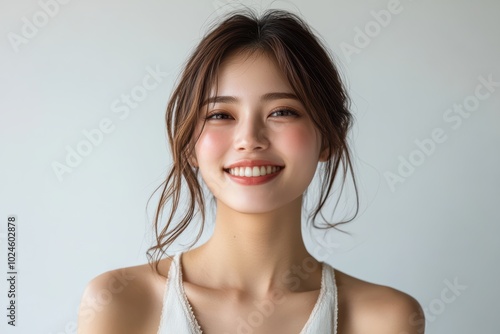 With radiant complexion, an Asian woman exudes elegance and vitality, making her image perfect for skincare and beauty product promotions.