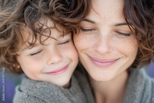 With the sun setting in the background, a close-up portrait shows a young mother embracing her son in a field of flowers, her eyes closed and a smile on her face