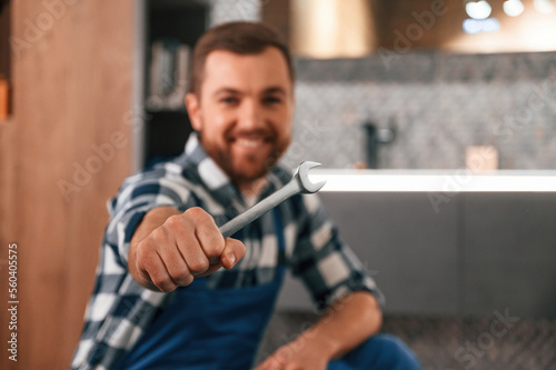 With wrench in hand. Plumber in blue uniform is at work in the bathroom