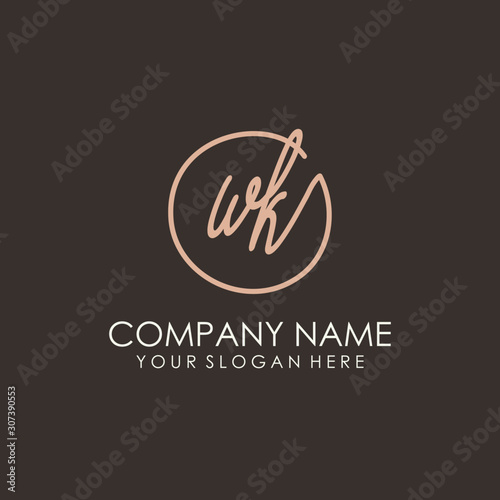 WK initials signature logo. Handwritten vector logo template connected to a circle. Hand drawn Calligraphy lettering Vector illustration.
