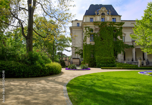 WOCLAW, POLAND - May 13.2020: Wroclaw Puppet Theater, view from the side of the old city park (Park Staromiejski). Warm sunny day.A lot of green vegetation.The concept of leisure and travel.
