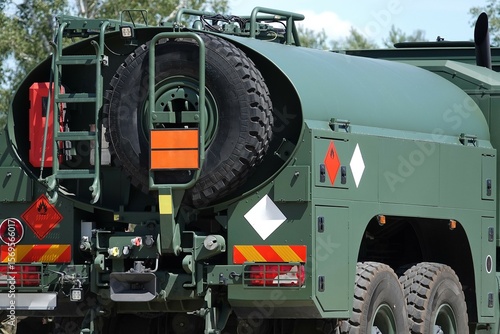 Wojskowa cysterna widziana z tyłu z kołem zapasowym