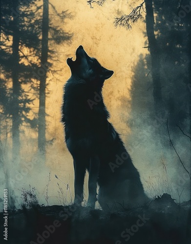 Wolf Howling Silhouette in Misty Forest at Dusk Night