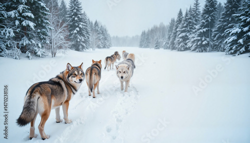 Wolf pack tracking prey in snowy forest, silent wild pursuit