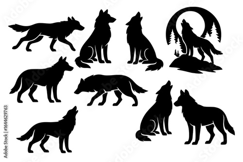 Wolf silhouettes vector set. Collection of running, standing, and howling wolves icons. Wild canine predator animal pack in forest. Wildlife nature illustration for logo or decal.