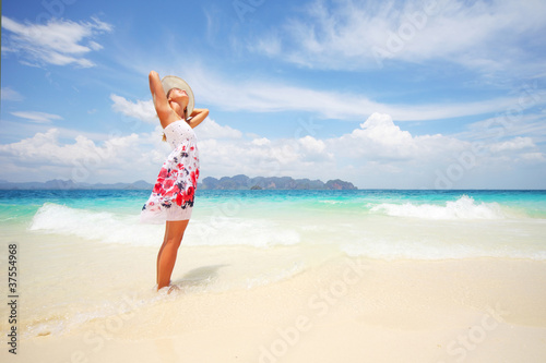 back, beach, beauty, body, cheerful, coast, day, dress, female, horizon, hot, lifestyle, looking, ocean, paradise, person, pleasure, pose, relax, relaxation, sea, season, single, sky, space, standing, summer, sunlight, sunny, sunshine, tan, travel, tropical, vacation, water, wave, wet, white, woman, young