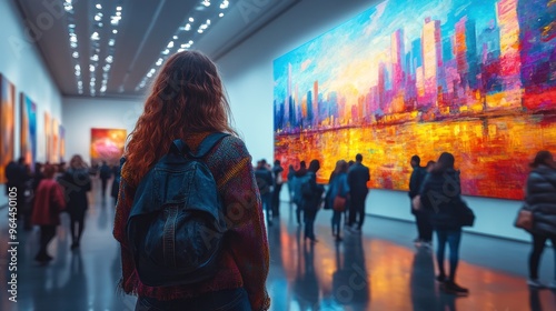 gallery, art, museum, painting, woman, people, artwork, exhibition, interior, culture, visitor, artist, contemporary, modern, visual, art, abstract, style, brushstroke, canvas, frame, lighting, space, lover, enthusiast, collector, spectator, audience, back, backpack, building, wall, floor, light, shadow, blur, colourful, bright, city landscape, skyline, landscape
