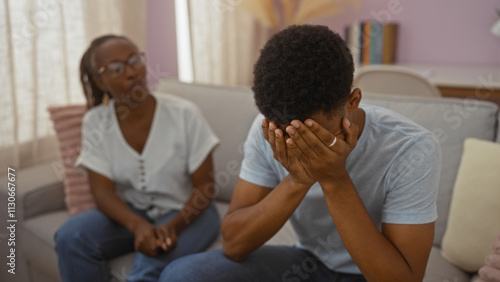 Woman and son sitting in living room, son with hands in face, expressing emotion, illustrating family love, indoor setting, african american, casual home attire, mother comforting son