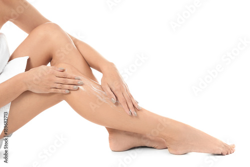 Woman applying body cream on her leg against white background, closeup