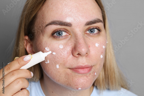 acne, adult, appearance, applying, background, beautiful, beauty, blemish, care, caucasian, clean, closeup, cosmetic, cosmetology, cream, dermatology, disease, face, facial, female, grey, health, hormone, hygiene, inflammation, macro, medicals, medicine, moisturiser, person, pimple, pore, portrait, problem, product, remedy, scar, sensitive, disease, skin, skincare, spot, therapy, treatment, tube, woman, young