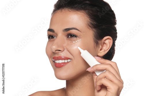 Woman applying cream under eyes on white background. Skin care