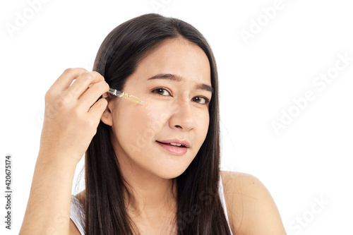 Woman applying oil serum from the pipette. Natural organic cosmetic