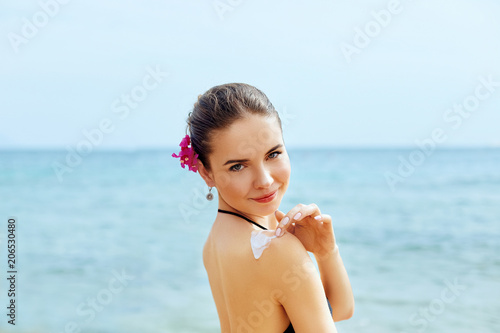 Woman applying sunscreen creme on tanned shoulder. Skincare. Body Sun protection sun cream. Bikini woman smear moisturizing lotion on back.