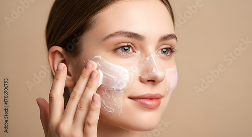 Woman applying white cream on her face with her hand in a skincare routine close up